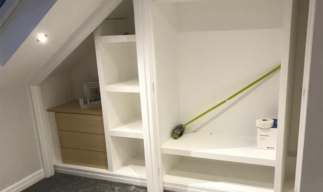 Loft conversion with bespoke storage solutions maximising every inch of available roof space.